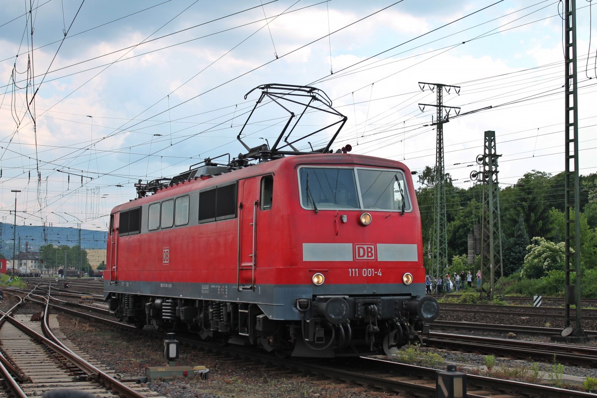 Nachschuss auf 111 001-4, die am 08.06.2013 sich dem Publikum auf der Fahrzeugparade des Sommerfestes des DB Museum in Koblenz-Lützel präsentiert.