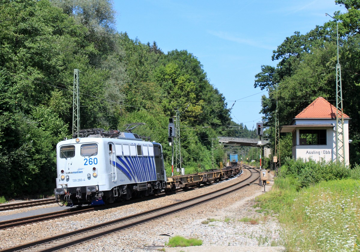 186 106-1 (Lokomotion) fährt am 22. August 2013 um 17:58 Uhr zusammen mit 186 285-3 und einem Güterzug durch Großkarolinenfeld