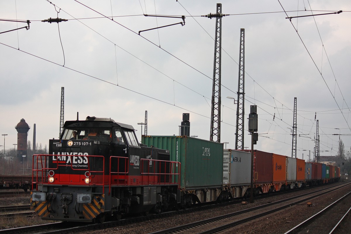 Die für LanXess werbende DuisportRail 275 107 am 19.3.13 mit einem Containerzug in Duisburg-Bissingheim.Der Zug machte anschließend in Entenfang Kopf und fuhr wieder Richtung Abzw.Lotharstraße zuruück.