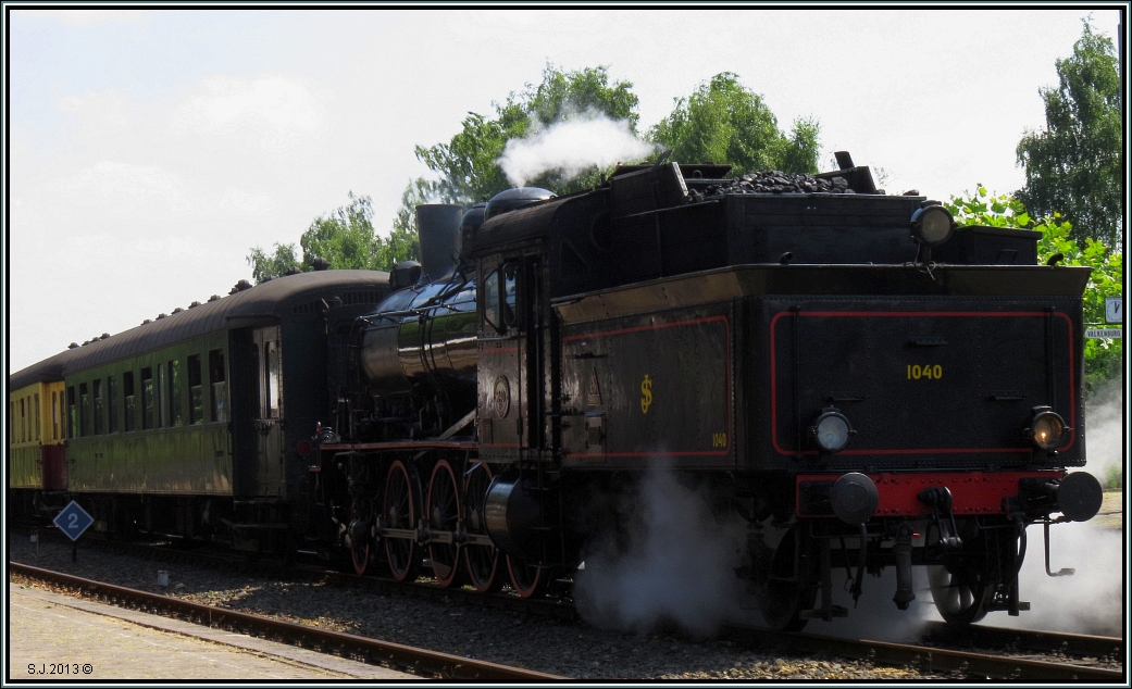 Die schwedische 1040 steht unter Dampf und wartet mit dem Sonderzug auf Ausfahrt nach Valkenburg. Sommeridylle am Bahnhof Simpelveld der Eisenbahnfreunde der ZLSM in den Niederlanden,Juli 2013.
