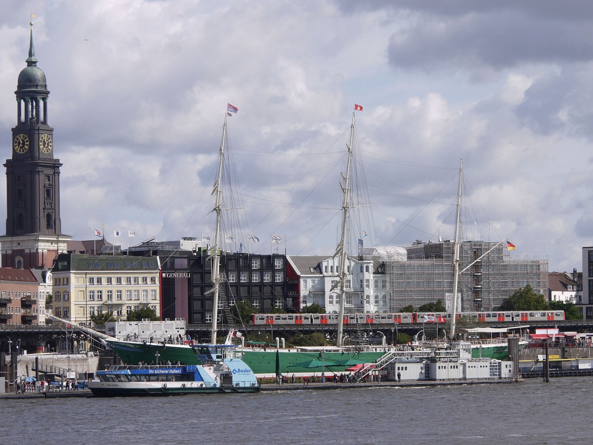 Ein U-Bahn-Zug Linie U3 der Hamburger Hochbahn zwischen den Stationen Baumwall und Landungsbrücken; links im Hintergrund der Michel, Hamburg, 01.09.2013