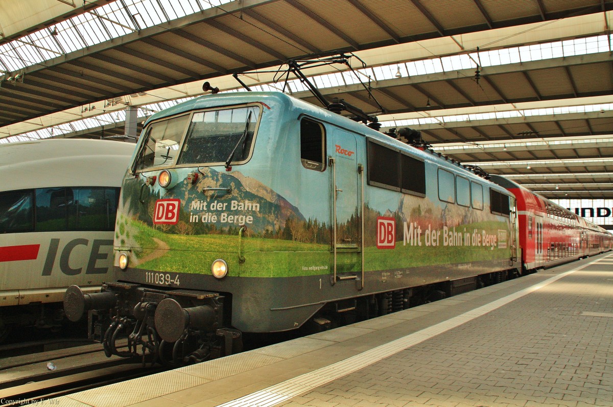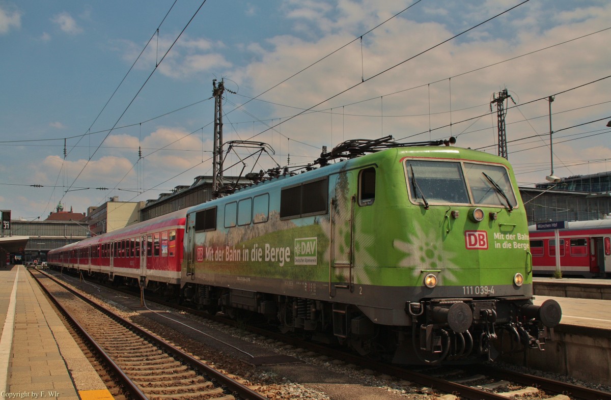 111 039-4 "Deutscher Alpen Verein (DAV)" mit einem Regionalexpress in München Hbf am 11.07.13.