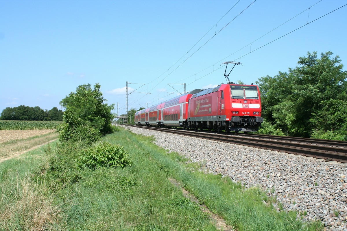 146 115 mit einem RE nach Offenburg am Nachmittag des 05.08.13 südlich von Buggingen.