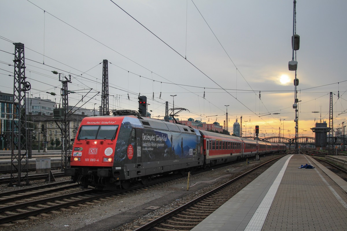 101 083 "Packendes Südafrika" im Abendlicht des 26. August 2013. Hier zu sehen bei der Einfahrt in den Münchner Hauptbahnhof.