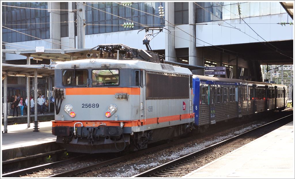 R55239 aus Vitre erreicht Rennes. Schiebende Lok ist 25689. (16.09.2013)