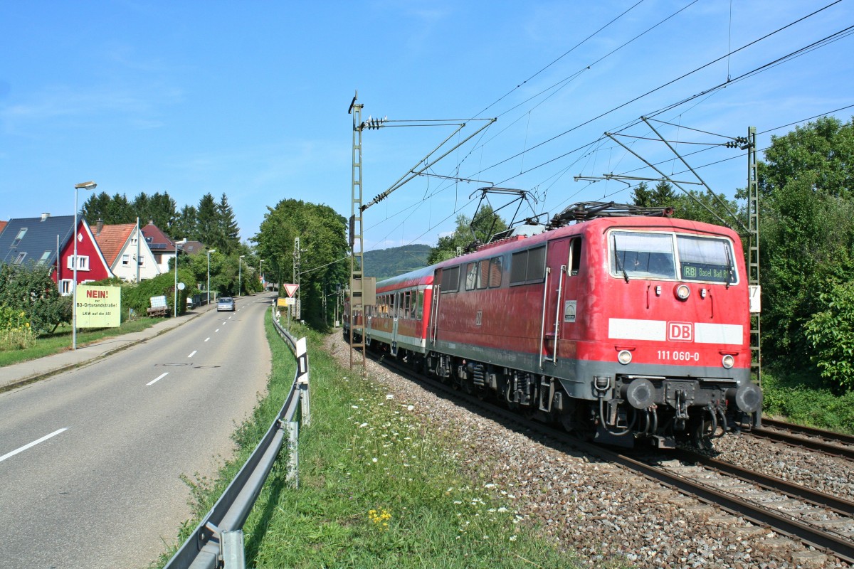 111 060-0 mit einer RB nach Basel Bad. Bf am Nachmittag des 15.08.13 südlich des Haltepunktes Schallstadt.