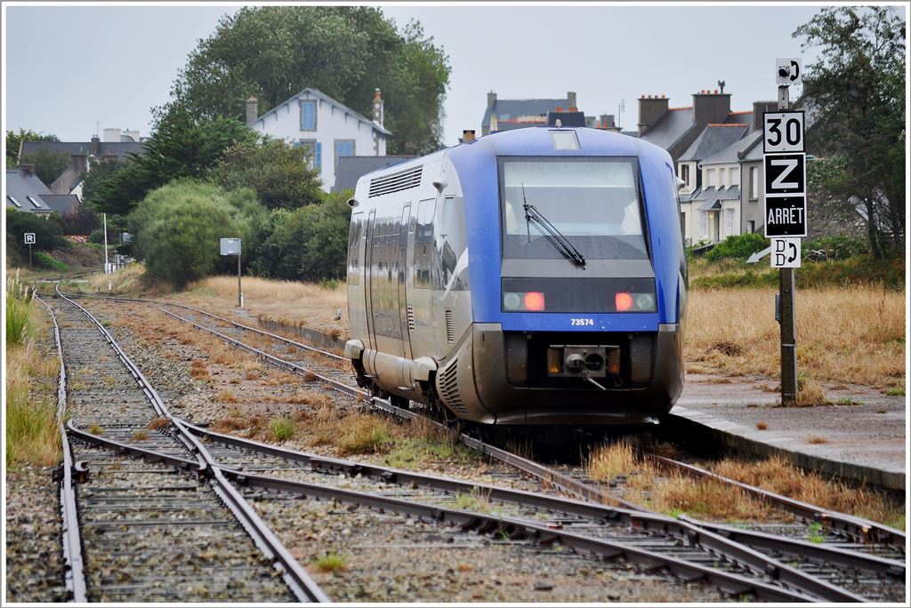Nach kurzem Aufenthalt tritt der 73574 als R55006 die Rückfahrt nach Morlaix an, wo TGV Anschluss nach Brest und Paris besteht. Abseits der Grandes Linies ist die Infrastruktur in einem zum Teil desolaten Zusatand. Roskoff. (17.09.2013)