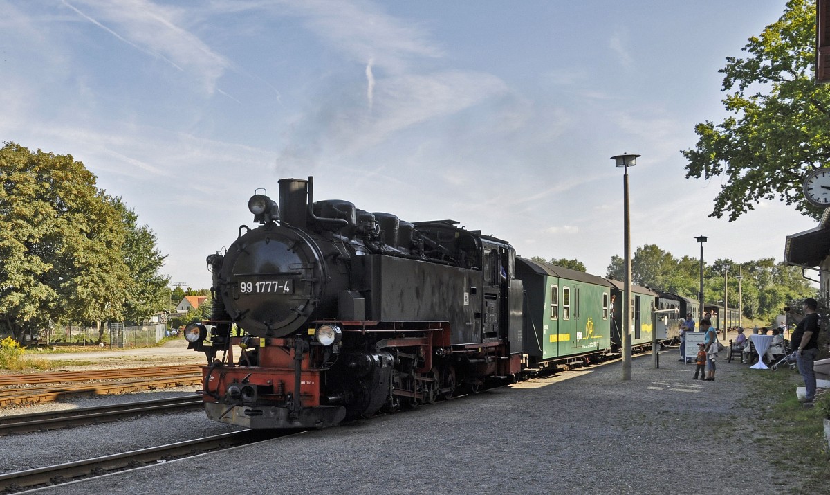 14.09.2013 Radeburg; nach dem Wassernehmen setzt die 99 1777-4 für die Rückfahrt um