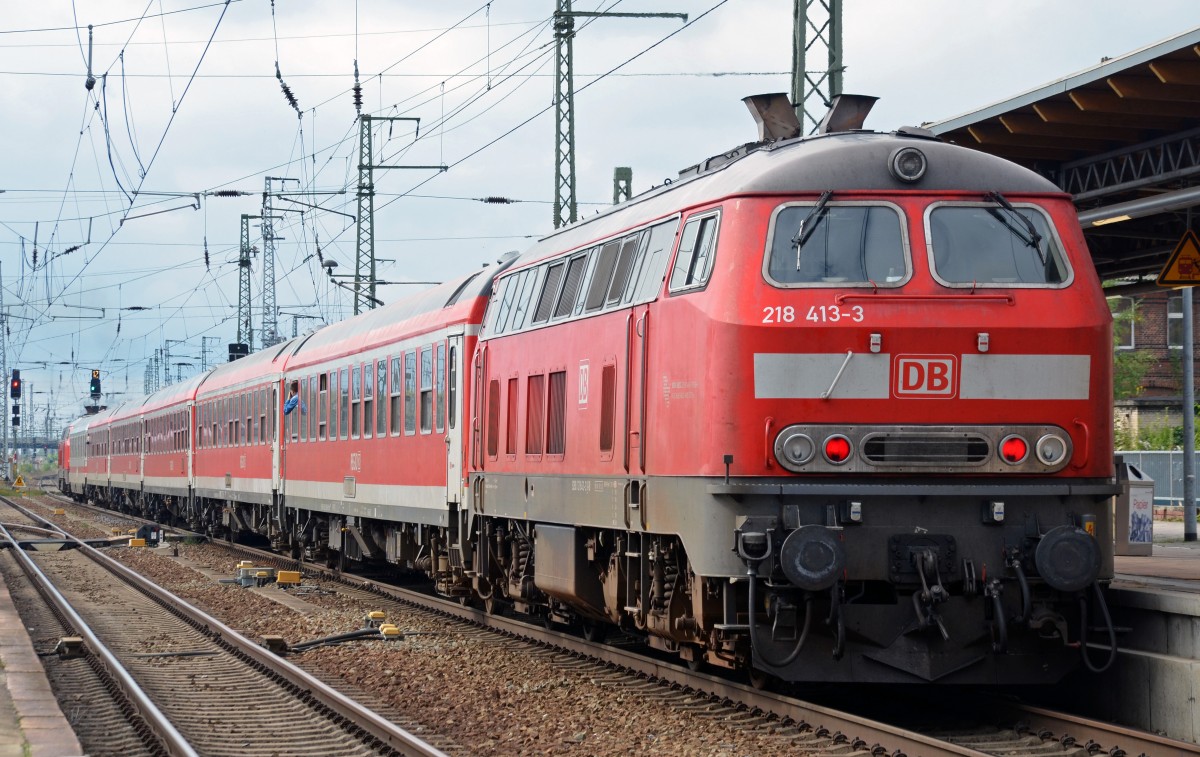 218 413 schob zusammen mit 218 465 an der Spitze den IC 18649 nach Hannover aus Stendal heraus.