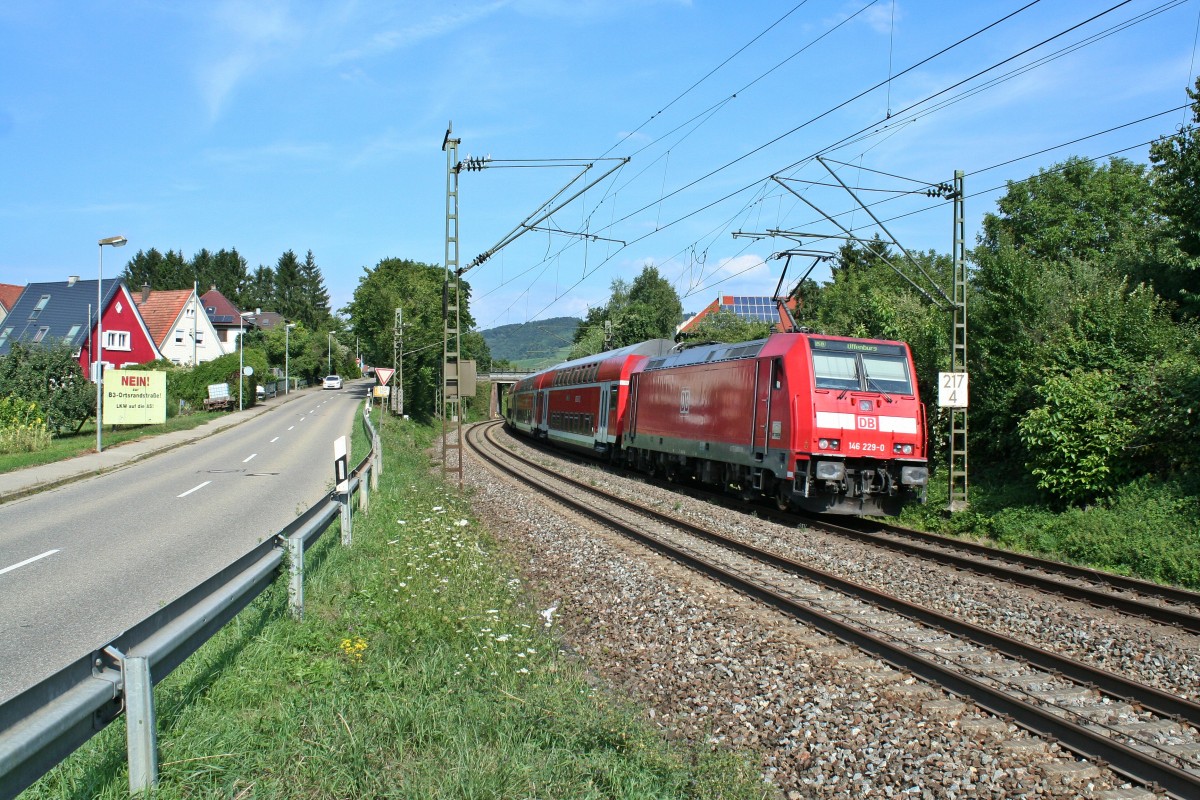 Allzu viele Möglichkeiten, den IC 2013 mit seiner 218-Doppeltraktion auf der Filsbahn zu fotografieren hat man leider nicht. Am 28. September 2013 wollte ich allerdings mal versuchen, ob sich der Zug nicht auch in Süßen, unterhalb von Staufeneck, ansprechend auf 's Bild bringen lässt. Versuchsobjekt war die letztgebaute 218, 218 499-2, zusammen mit einer weiteren Ulmer 218 und dem IC-Wagenpark.