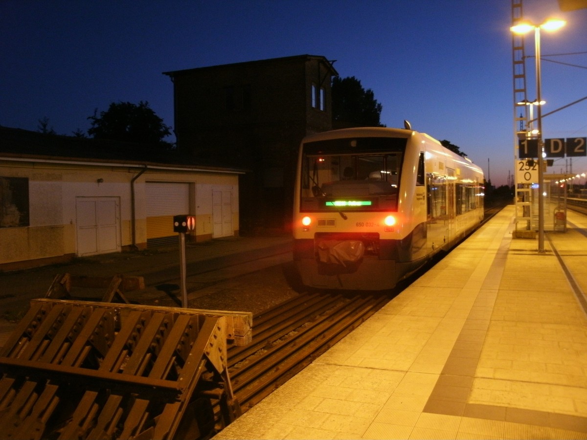 Der letzte Zug,auf der Strecke Bergen/Rügen-Lauterbach Mole,ist der PRE 81287 der Bergen/Rügen um 19:40 Uhr verläßt und nur bis Putbus zur Nachtruhe fährt.Hier steht der VT650 032,am 29.September 2013,in Bergen/Rügen.