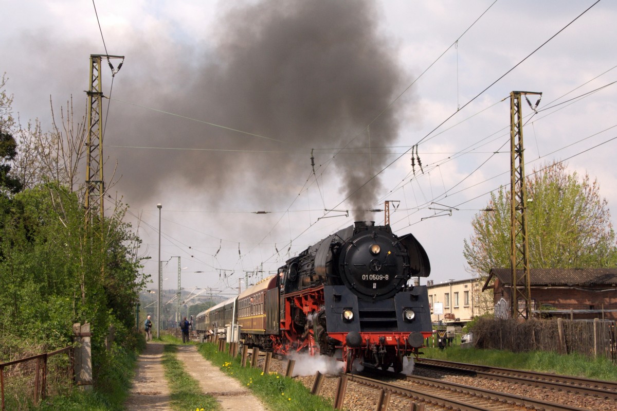 01 0509-8 zieht am 12.04.2014 zusammen mit 03 1010 und 23 1097 als Schublok einen Sonderzug durchs Elbtal. Aufgenommen kurz vor Strand