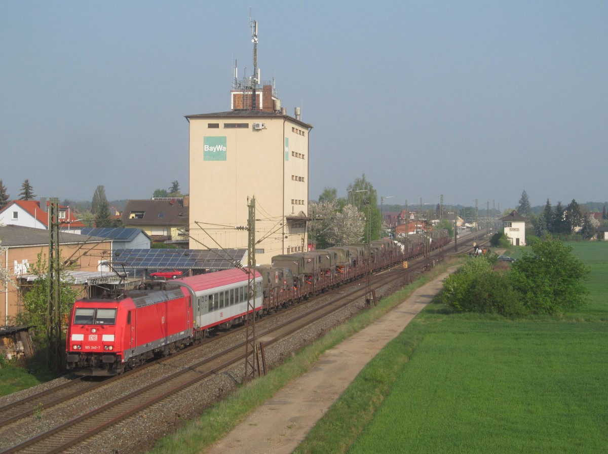 185 340-7 mit ÖBB-Liegewagen und Militärzug am 13. April 2014 in Hirschaid.