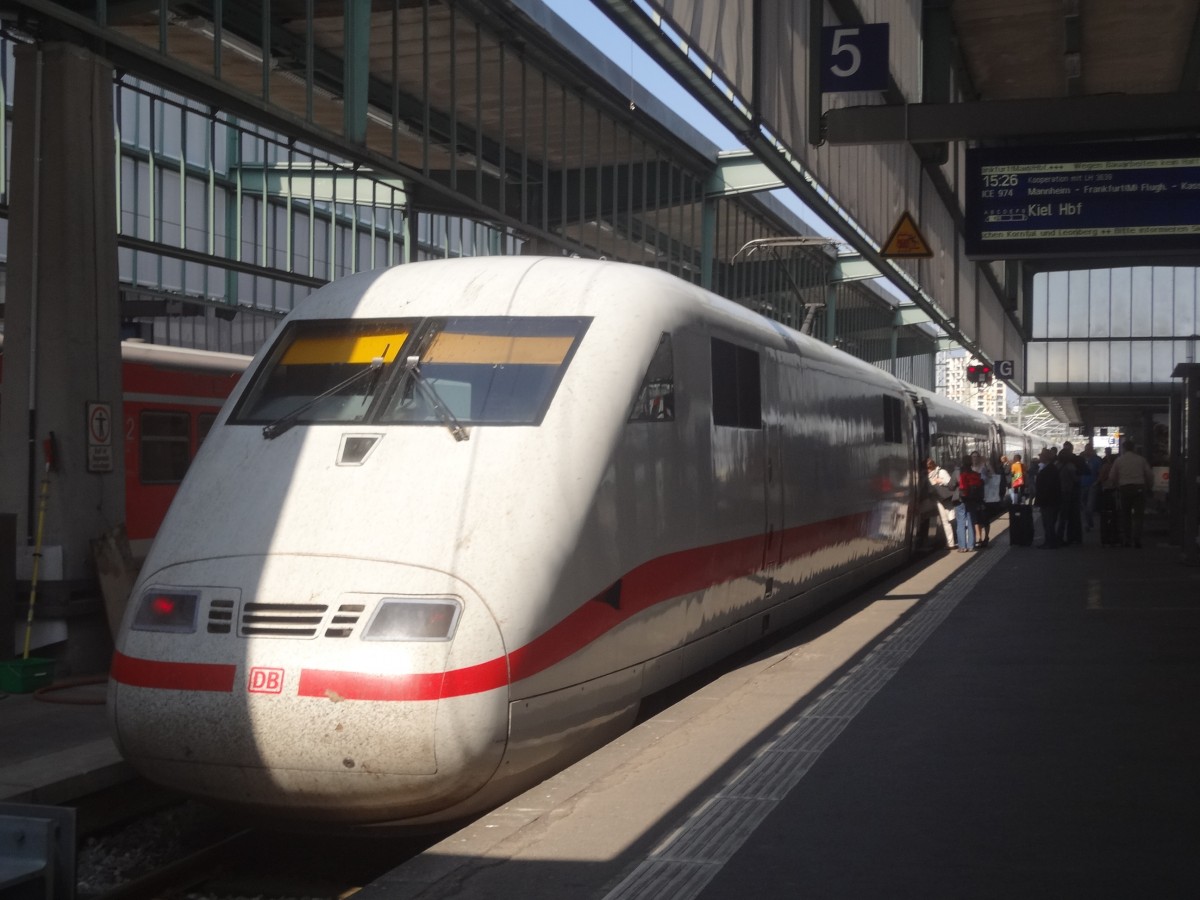 407 01* legt als ICE712 in Mainz einen kurzen Zwischenstopp ein, um gleich auf die Neubaustrecke KRM zu kommen. (April 2014)