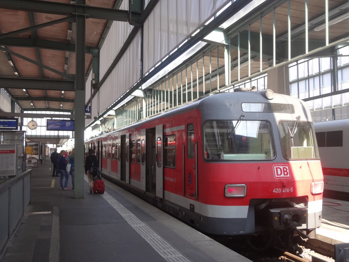 420 414 wartet in Stuttgart Hbf als S-Bah auf die Abfahrt. Warum diese eine oben fuhr, ist mir nicht bekannt. (April 2014)