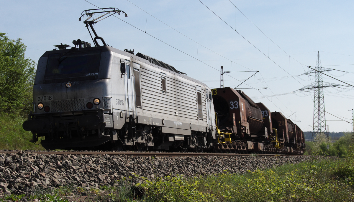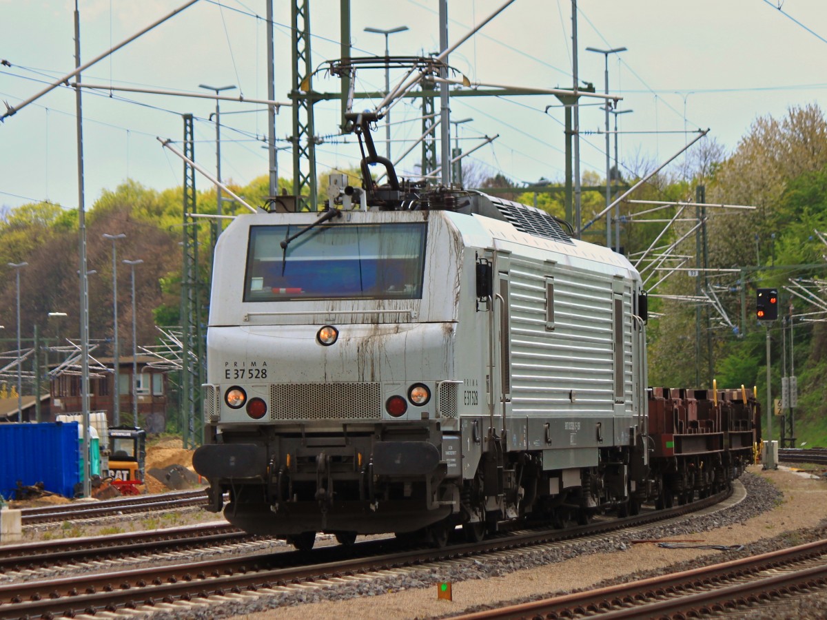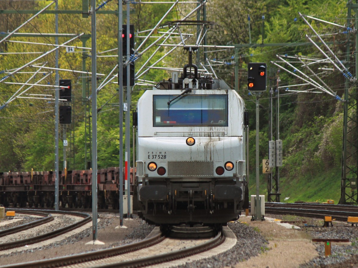 Mit einem leeren Coilzug am Haken verläßt E37 528 am 14.04.2014 Aachen West auf der KBS 485 Richtung Herzogenrath.