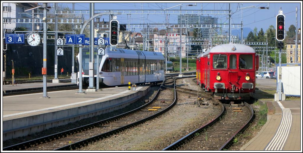 Bt 31 und ABDeh 2/4 kommen vom Hafen zurück und kreuzen den ausfahrenden GTW nach Romanshorn. (14.04.2014)