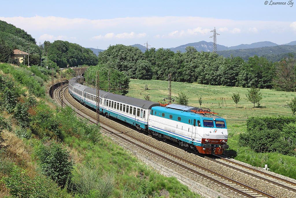 E.444 099 passes Rigoroso whilst working Inter City train 669 from Milano Centrale-La Spezia Centrale, 10 July 2012