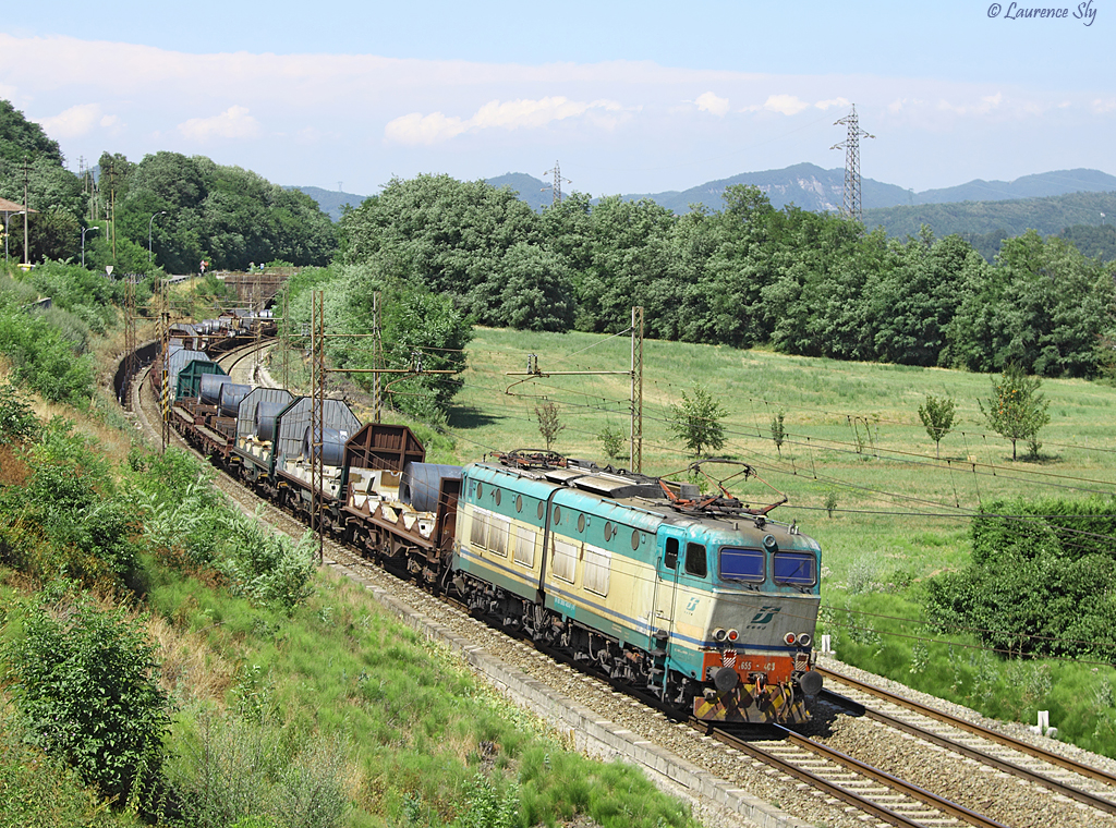 E.655 403 banks a steel train past Rigoroso, 10 July 2012