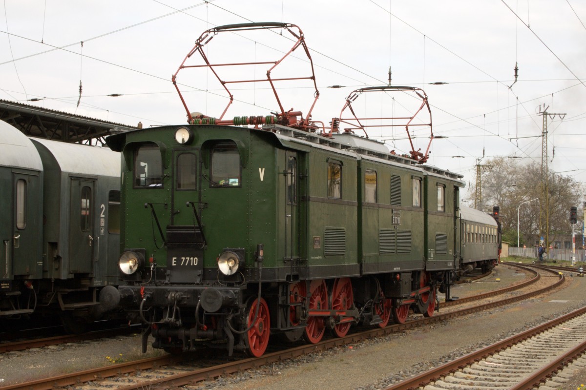 E77 10 stand am 11.04.2014 anlässlich des 6. Dresdener Dampfloktreffens in Riesa abgestellt, nachdem sie kurz zuvor einen Sonderzug aus Dresden gebracht hatte