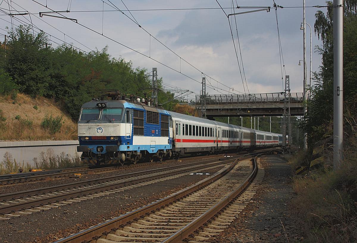 Mit einer Eurocity Garnitur der Deutschen Bahn ist der slowakische Gorilla 350004 am 13.9.2009 hier bei Durchfahrt in Zabori nad Labem auf dem Weg nach Prag.