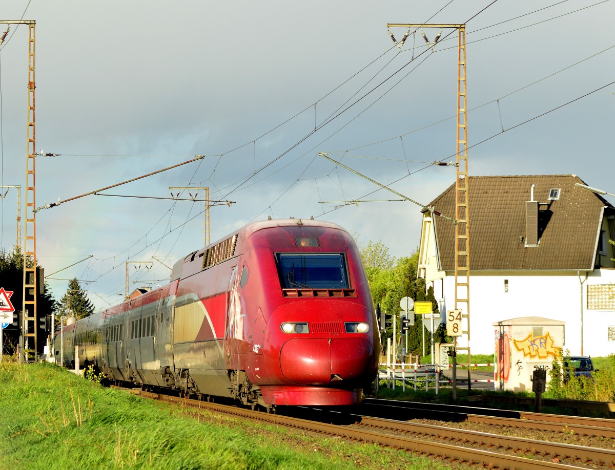 Thalys 4303 nach Paris Gare du Nord ist hier am Bü Dahler Weg in Wickrath gen Aachen fahrend zu sehen am Montag den 14.4.2014