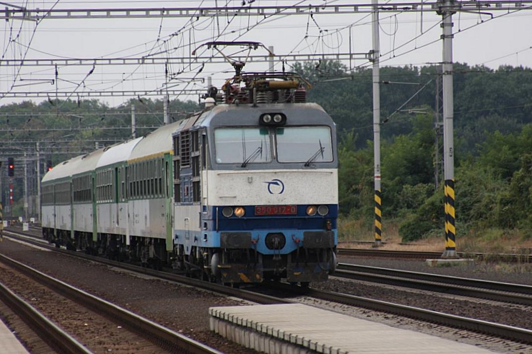 ZSR Gorilla 350012 fährt am 13.9.2009 im Bahnhof Zabori nad Labem mit einem Schnellzug aus Prag durch.