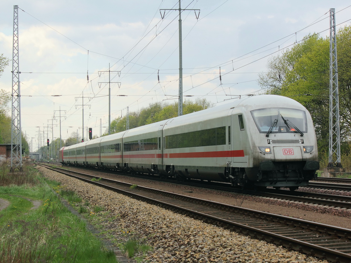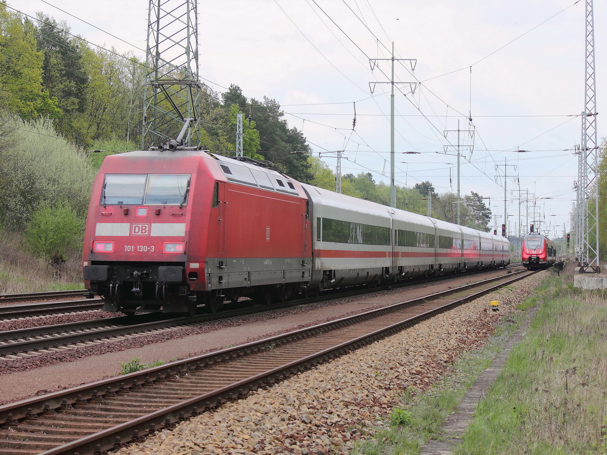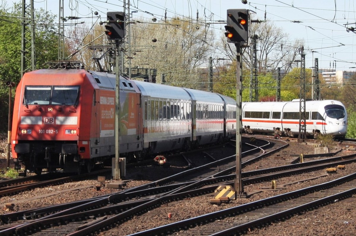 Hier links 101 092-5 mit IC2229 von Kiel Hbf. nach Nürnberg Hbf. und rechts 605 018-1 "Jever" als Leerzug, diese beiden Züge fuhren am 16.4.2014 in Hamburg Hbf ein.