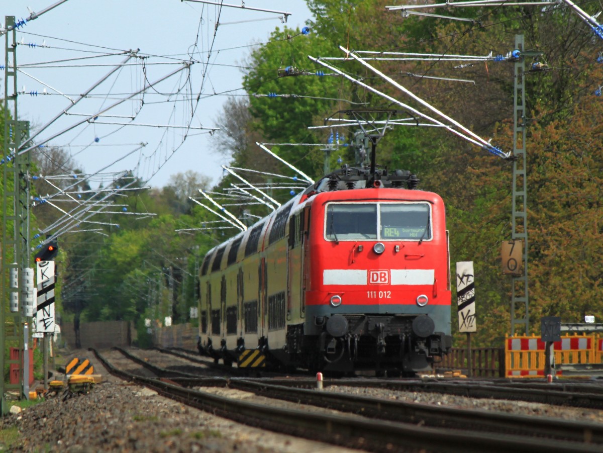 111 012 schiebt RE4 am 17.04.2014 auf der KBS 485 bei Laurensberg Richtung Herzogenrath.