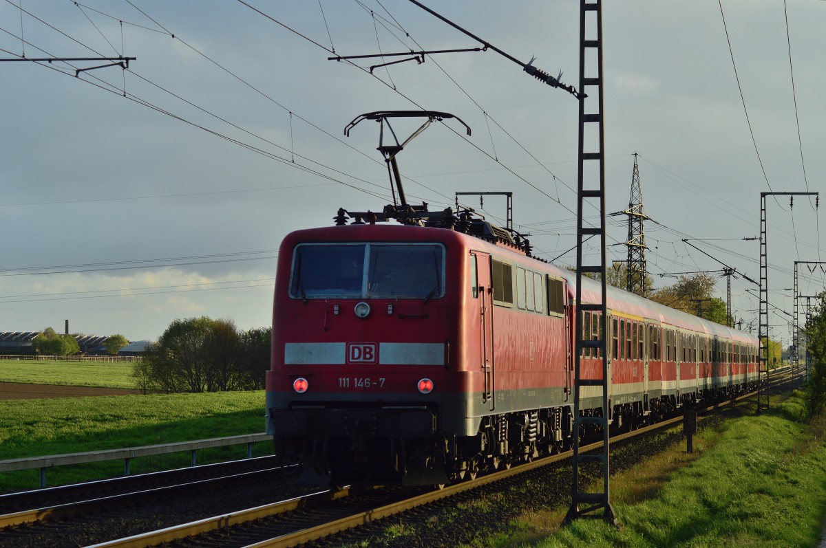 111 146-7 schiebt einen RE4 Verstärkerzug in Richtung Aachen über die Kbs 485 bei Wickrath. 14.4.2014