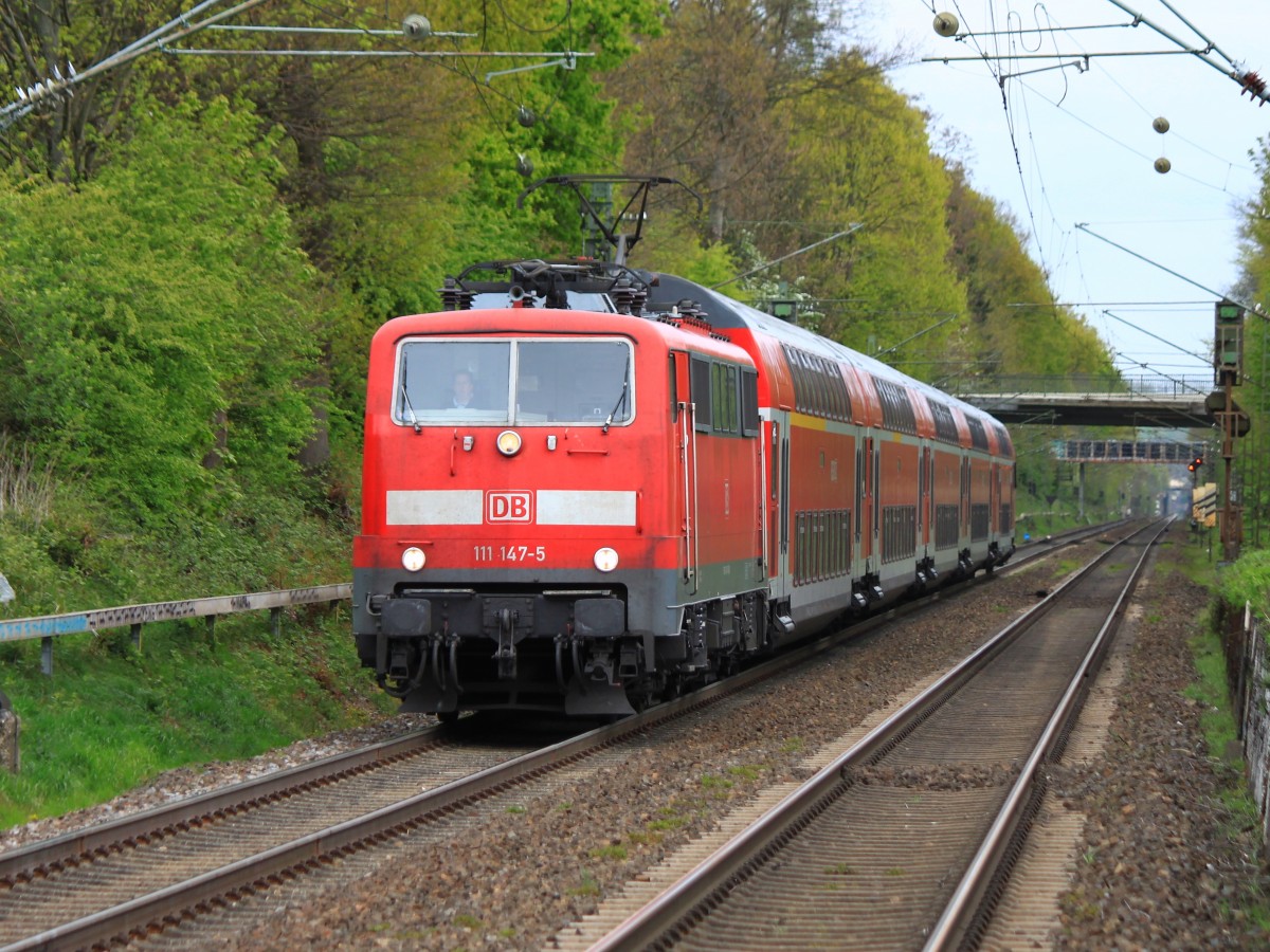 111 147-5 mit dem RE4 am Haken am 15.04.2014 auf der Rampe von Herzogenrath nach Kohlscheid.