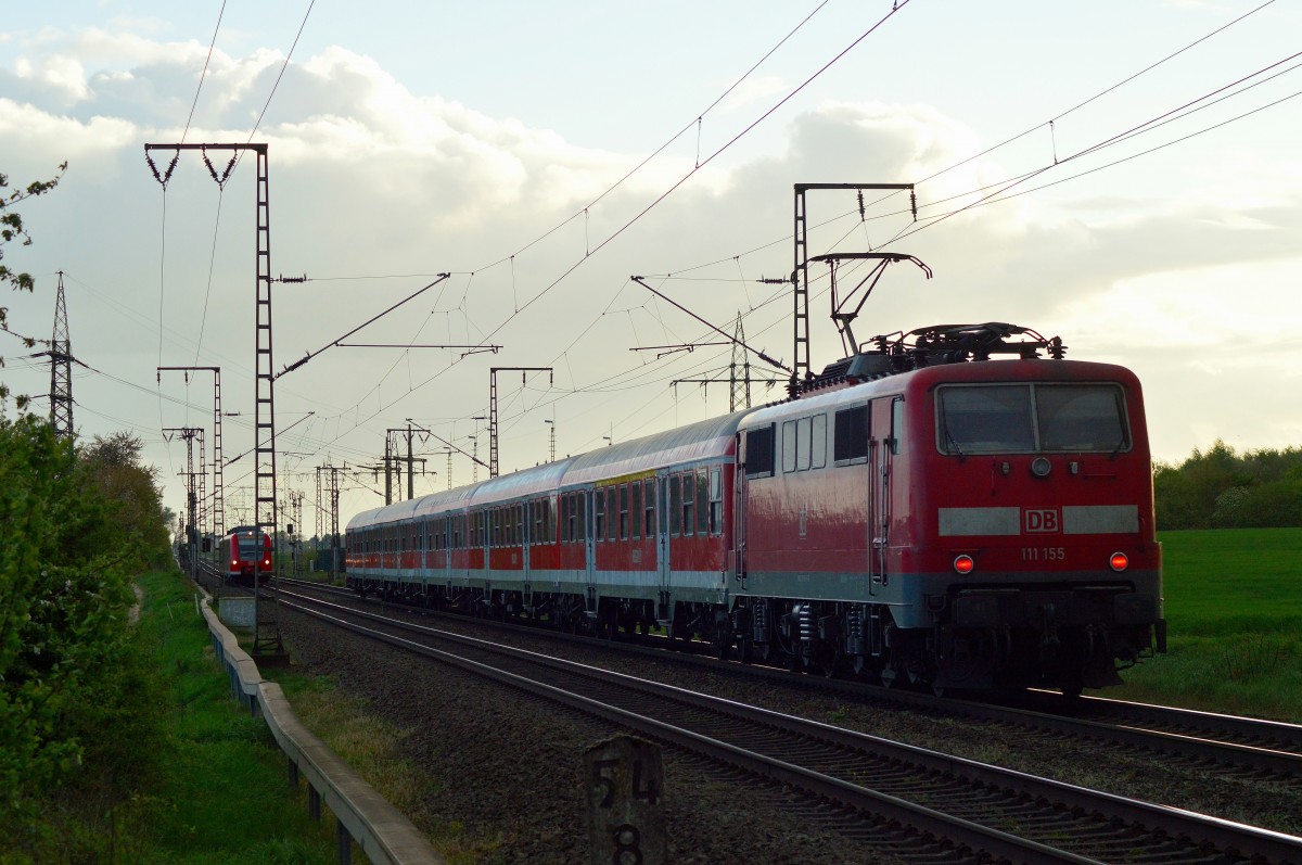 111 155 schiebt auch einen N-Wagenzug gen Aachen am Montag den 14.4.2014 bei Wickrath.