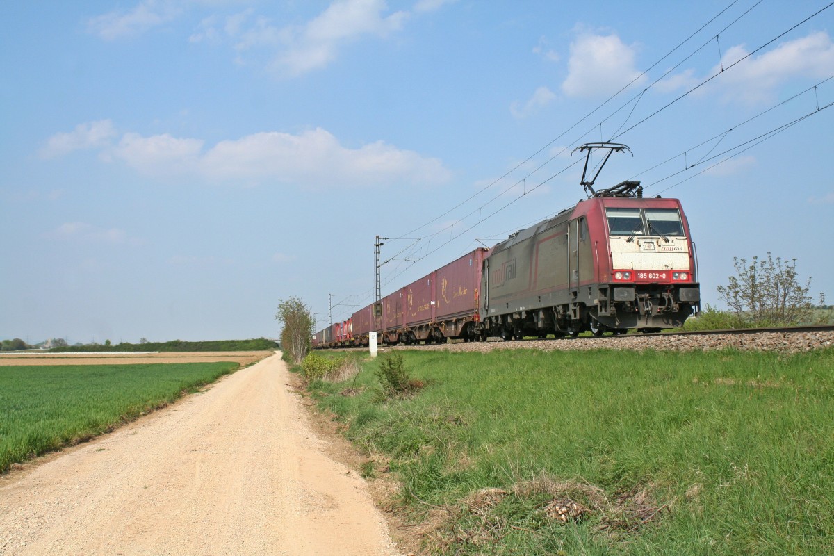 185 602-0 mit einem KLV-Zug in Richtung Schweiz am Nachmittag des 13.04.14 südlich von Hügelheim.