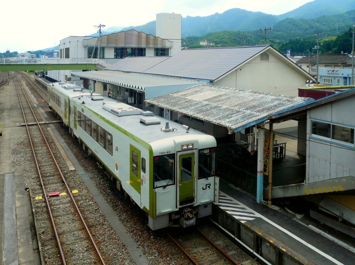 Ôfunato-Linie, Stadt Ôfunato: Das Triebwagenpaar KIHA 100-42 und KIHA 100-33 ist an der Endstation im Ortsteil Sakari eingetroffen. 9.Juli 2010.
