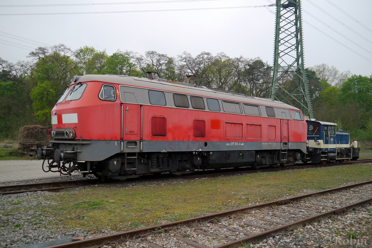 217 012-4 der Pfalzbahn steht zusammen mit der Köf 332 128-8 auf dem Gelände der Historischen Eisenbahn Mannheim. Die 217 wurde vor kurzem von der Pfalzbahn gekauft und ist wieder im Betrieb!