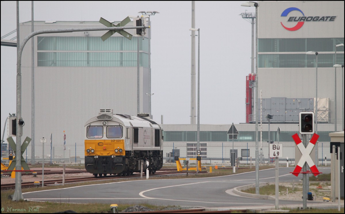 247 020-1 (266 420-9) wartet hier abgestellt auf der Vorstellgruppe am Jade-Weser-Port darauf, das Ihr Containerzug beladen wird. Wilhelmshaven 22/04/2014