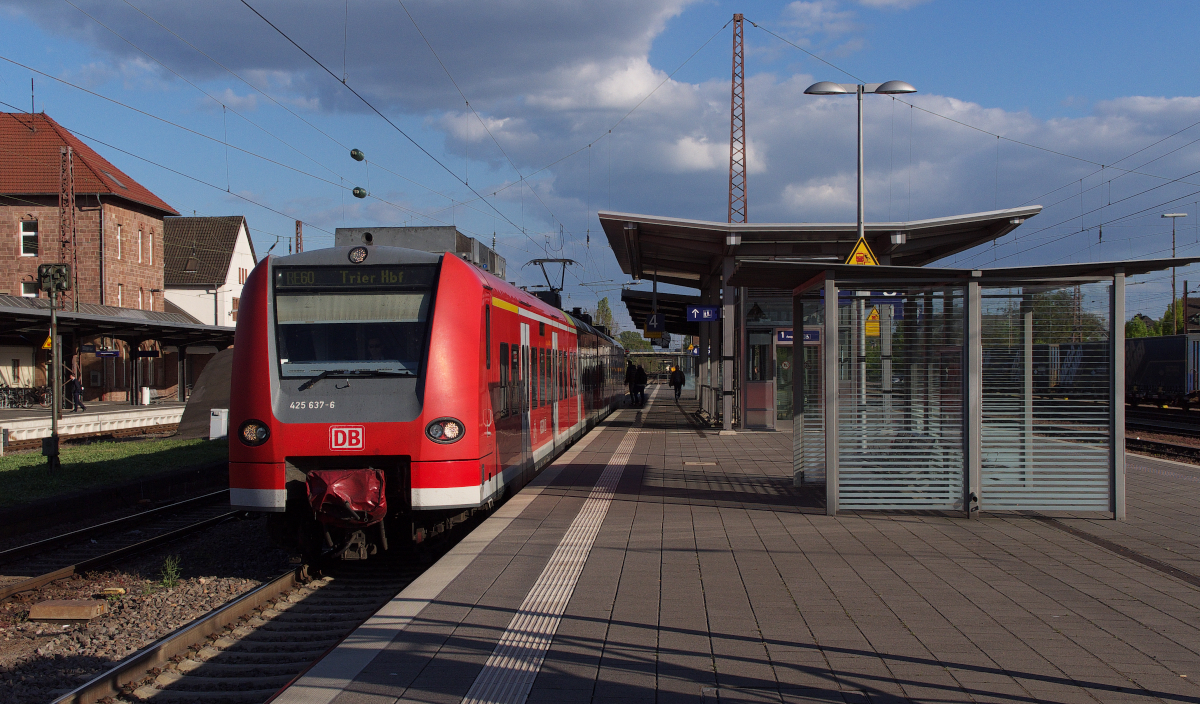 425 137 muß über die Osterfeiertage arbeiten und ist als RE von Kaiserslautern nach Trier am 18.04.2014 unterwegs. Der Zug hat Planhalt in Dillingen Saar.