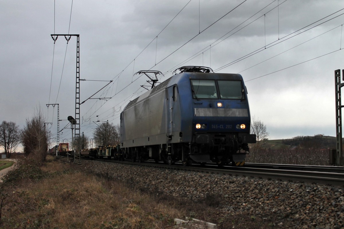 Am bedeckten 28.02.2014 fuhr die Alpha Trains/Crossrail 145-CL 202 mit einem Containerzug durch die Bahnanlagen von Müllheim (Baden) gen Süden.