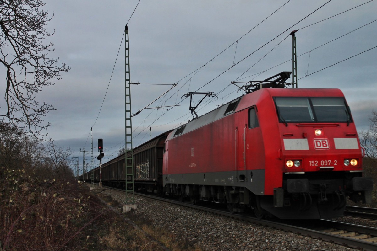 Ausfahrt am 14.02.2014 von der 152 097-2 mit einem Redbull-Zug nach Bludenz aus den Bahnanlagen von Müllheim (Baden).
