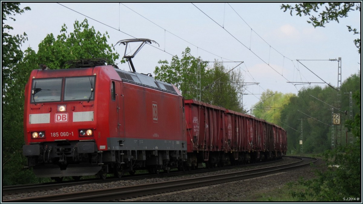 Die 185 060-1 mit ihrer Güterfracht am Haken im Gleisbogen bei Rimburg auf der Kbs 485. Bildlich festgehalten am 16.April 2014.