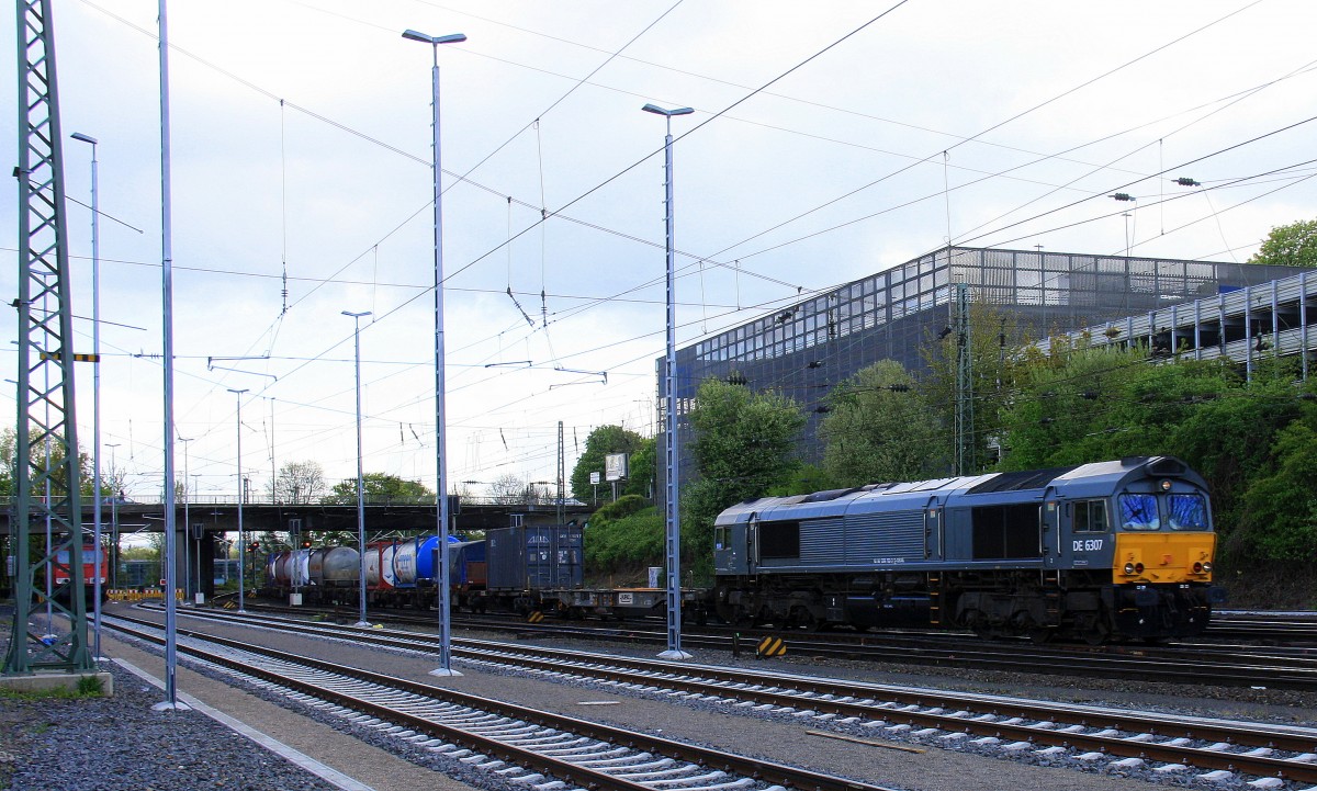 Die Class 66 DE6307 von DLC Railways kommt aus Richtung Montzen/Belgien mit einem langen Containerzug aus Zeebrugge-Ramskapelle(B) nach Segrate(I) und fährt in Aachen-West ein bei Sonne und Wolken am Nachmittag vom 18.4.2014.