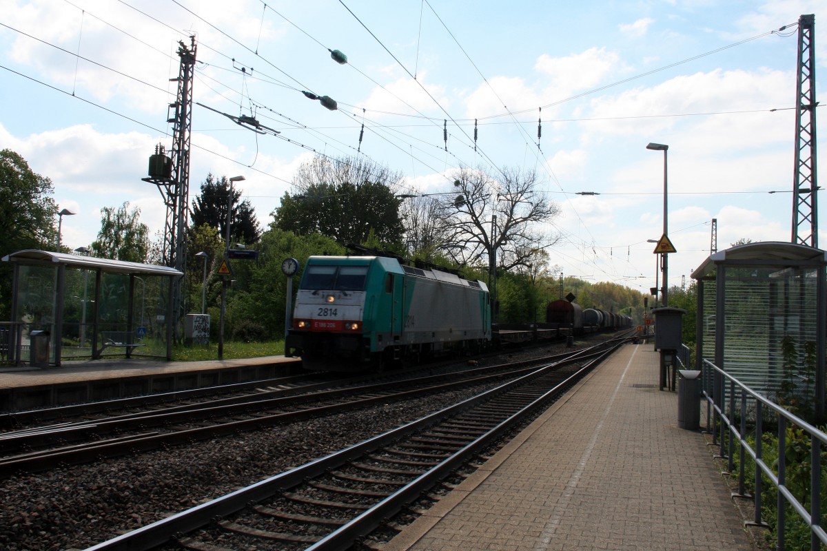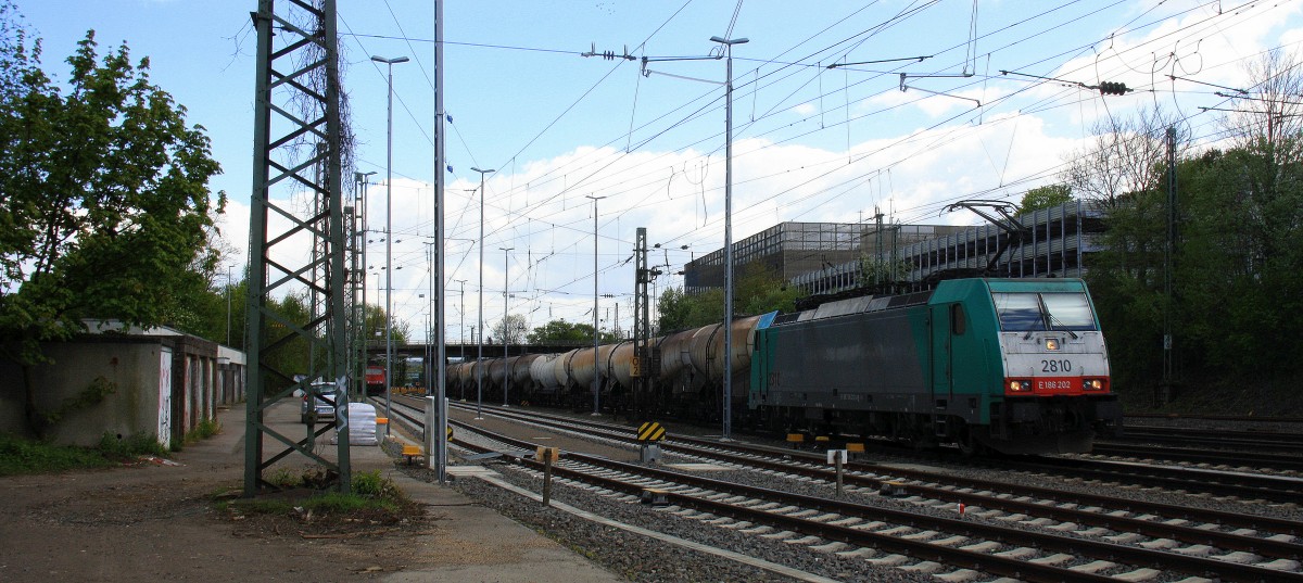 Die Cobra 2810 kommt aus Richtung Montzen/Belgien mit einem Kurzen Kesselzug aus Antwerpen-Kanaaldok(B) nach Millingen und fährt in Aachen-West ein bei Sonne und Wolken am Nachmittag vom 18.4.2014.