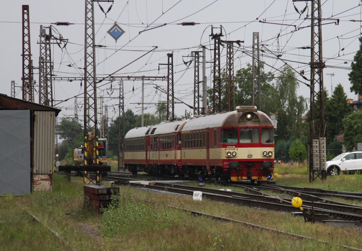 Ein alter Triebwagen der Reihe 854 fuhr als Os am 18.8.2013 aus Richtung Podebrady in den Bahnhof Velky Osek ein. Der Motorwagen befand sich in diesem Fall in der Mitte dieser interessanten Garnitur. Vorweg lief 80-29208-3. Dabei dürfte es sich um einen Steuerwagen handeln. - Wer dazu näheres weiß, kann es gerne ergänzen.