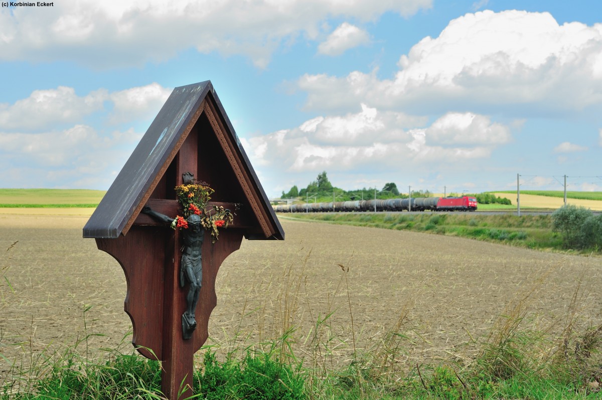 Ein schönes Motiv ergab sich am 13.08.2013 in Hebertshausen als eine unbekannte 185 mit einem Kesselwagenzug aus Ingolstadt nach München passierte.