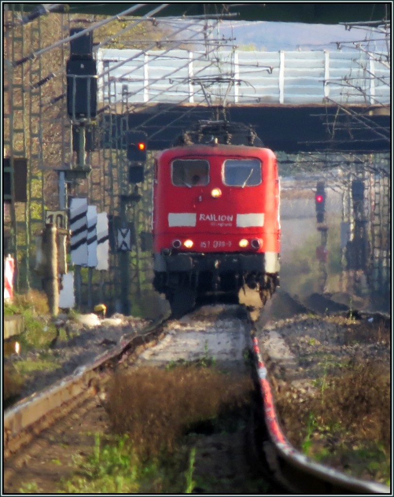 Experiemente am Bahndamm! Als ob sie gleich dahinschmilzt im Hitzegeflimmer auf den Gleisen bei Lintorf Ratingen. Die 151 in der Ferne am 29.März 2014.