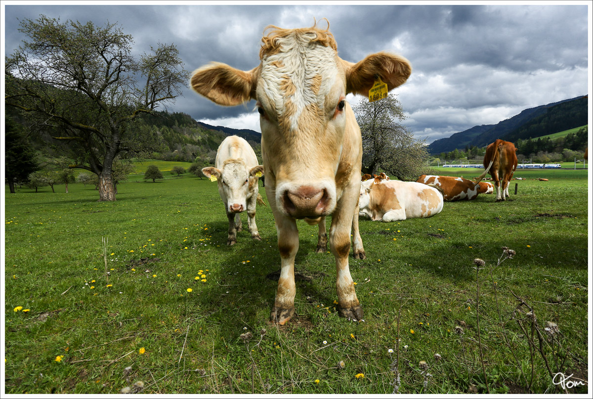 Im Muuuuuhrtal - Eigentlich war ich auf der Suche nach blühenden Bäumen, dann kamen mir diese Kühe in die Quere. Im Hintergrund der blaue Ski Austria Railjet 1116 251 auf der Fahrt von Wien nach Villach.