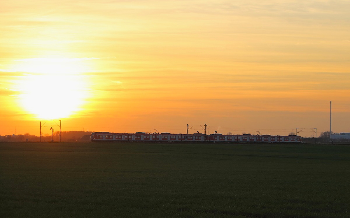 In der Abendsonne des 20.03.2014 ist eine 423-Doppeltraktion als S 11 zwischen Allerheiligen und Nievenheim unterwegs