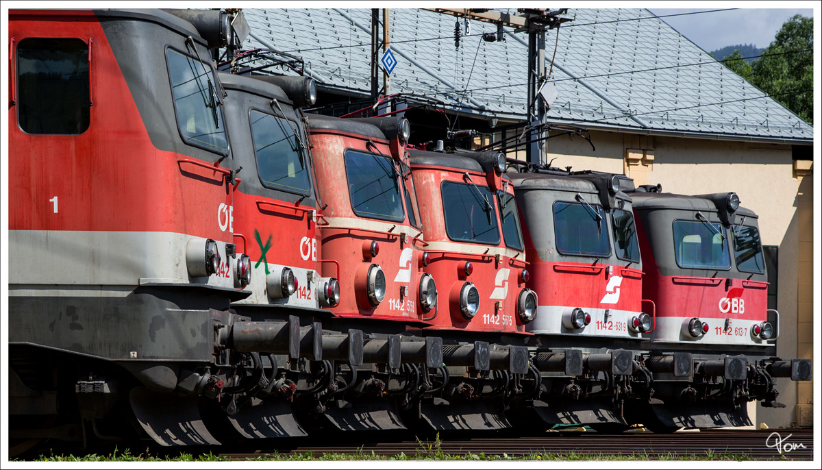 In Reih und Glied stillgestanden - 1142 658 + 1142 615 + 1142 575 + 1142 567 + 1142 631 + 1142 613, präsentieren sich anlässlich des 50 Jahr Jubiläums 1X42, auf der Drehscheibe in Selzthal.