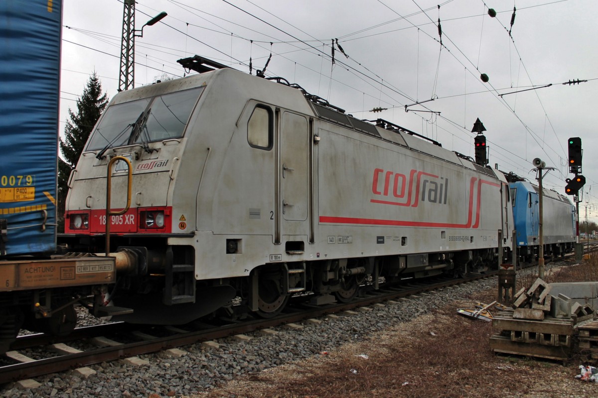 Lokportrait von der CB Rail/Crossrail 186 905 XR, als sie am 28.02.2014 von der 185 527-9 zusammen mit einem LKW Walter Containerzug in Richtung Schweiz überführt wurde. Hier ist die Fuhre bei der Ausfahrt von Gleis 13 in Müllheim (Baden).