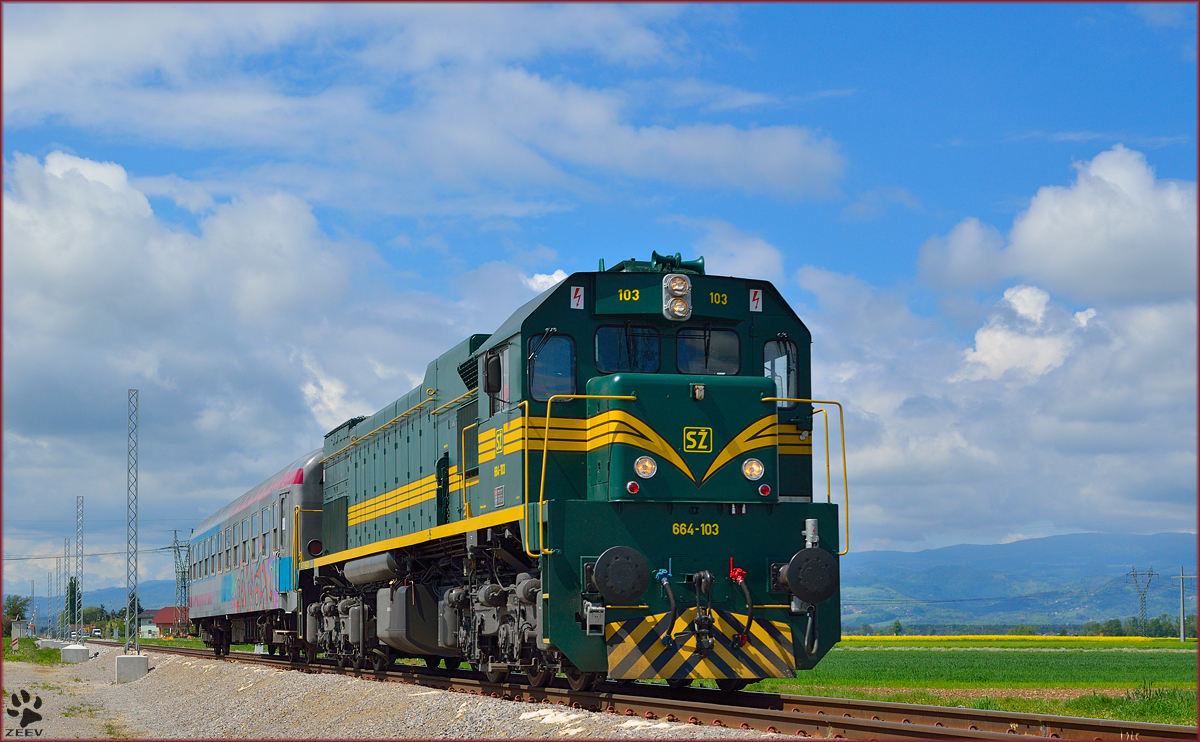SŽ 664-103 zieht MV247 'Citadella' durch Cirkovce Richtung Budapest. /22.4.2014